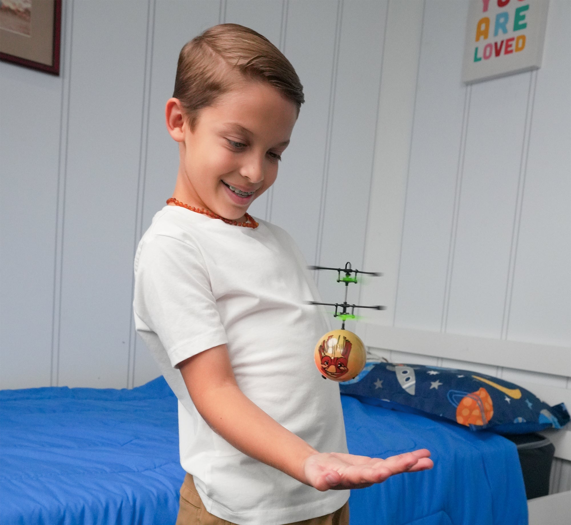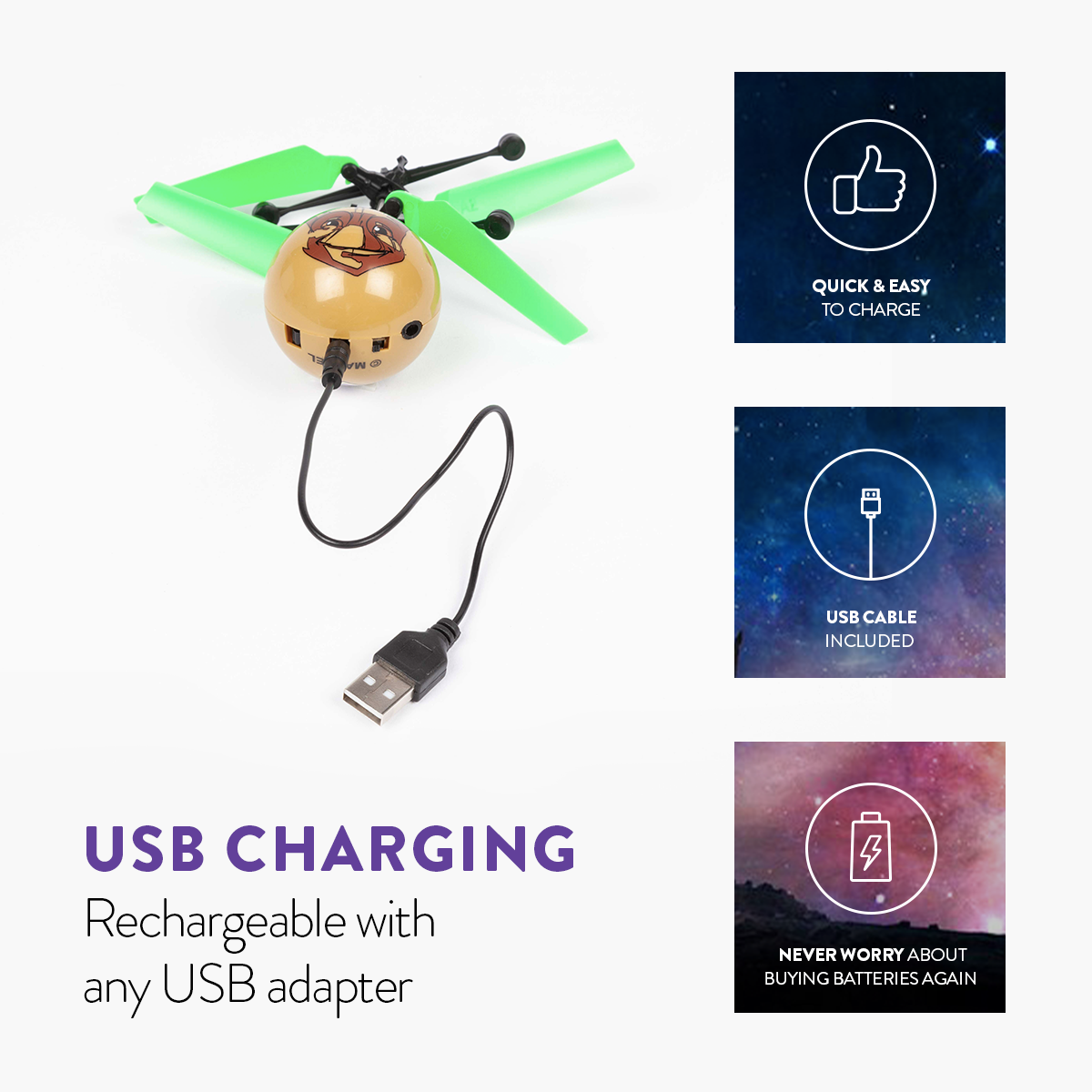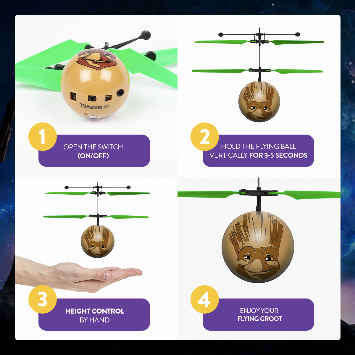 Introducing the Marvel Licensed Guardians of the Galaxy Baby Groot IR UFO Heli Ball! Featuring a coaxial rotor system for precise movement and increased stability when hovering. The UFO Heli Ball's body is also constructed with a durable material making it strong yet lightweight so you don't have to worry about breaking anything when it lands a bit too rough. Simply turn on and launch to get started, holding your hand underneath it will keep it hovering up in the air. When done flying you can try and grab it but you can also use any IR remote control to shut down and recover safely, it's that easy! A must have for fans of helicopters, get the Marvel Guardians of the Galaxy Baby Groot IR UFO Heli Ball today!