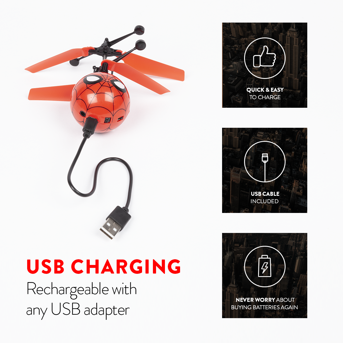 Introducing the Marvel Licensed Spider-Man IR UFO Heli Ball! Featuring a coaxial rotor system for precise movement and increased stability when hovering. The UFO Ball Helicopters body is also constructed with a durable material making it strong yet lightweight so you don't have to worry about breaking anything when it lands a bit too rough. Simply turn on and launch to get started, holding your hand underneath it will keep it hovering up in the air. When done flying you can try and grab it but you can also use any IR remote control to shut down and recover safely, it's that easy! A must have for fans of helicopters, get the Marvel Licensed Spider-Man IR UFO Heli Ball today!