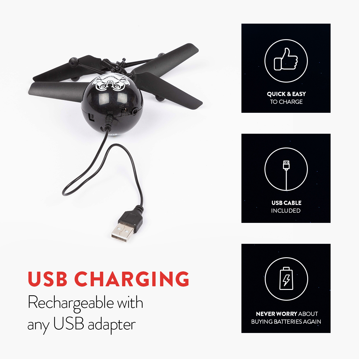 Introducing the Star Wars StormTrooper IR UFO Heli Ball! Featuring a coaxial rotor system for precise movement and increased stability when hovering. The UFO Ball Helicopters body is also constructed with a durable material making it strong yet lightweight so you don't have to worry about breaking anything when it lands a bit too rough. Simply turn on and launch to get started, holding your hand underneath it will keep it hovering up in the air. When done flying you can try and grab it but you can also use any IR remote control to shut down and recover safely, it's that easy! A must have for fans of helicopters, get the Star Wars StormTrooper IR UFO Heli Ball today!