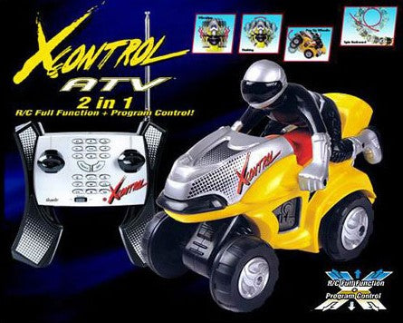 Take a thrilling ride with this most daring, far out ATV! You can program all the function from the control and then watch the ATV in action or you can use it as a remote control! You can pop wheelies, spin backwards, do 360s! Equipped with a real working headlight and awesome sound effects, and a rider equipped with a full set of racing gear. The ATV has 2 in 1 functions, Program it and watch it in action or use it as a normal remote control ATV. You will be amazed how fun this item is!!